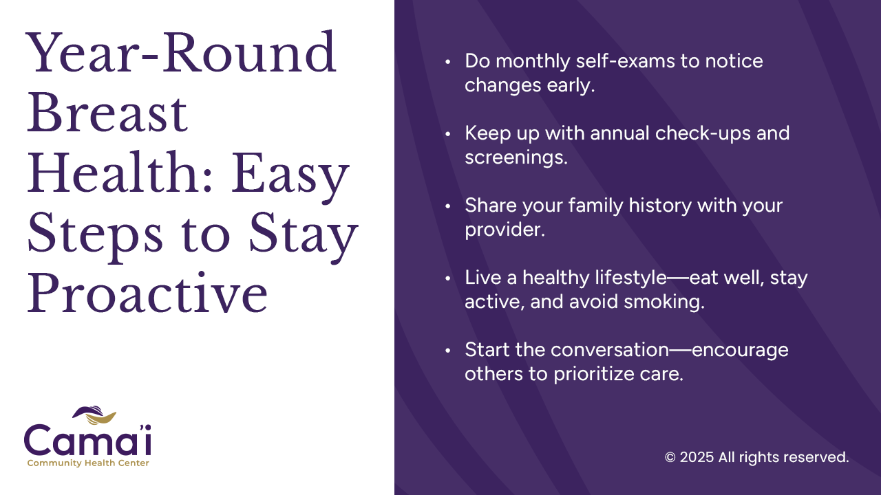 While October helps shine a light on this issue, breast health is something to prioritize year-round. Here are some simple ways to stay proactive: