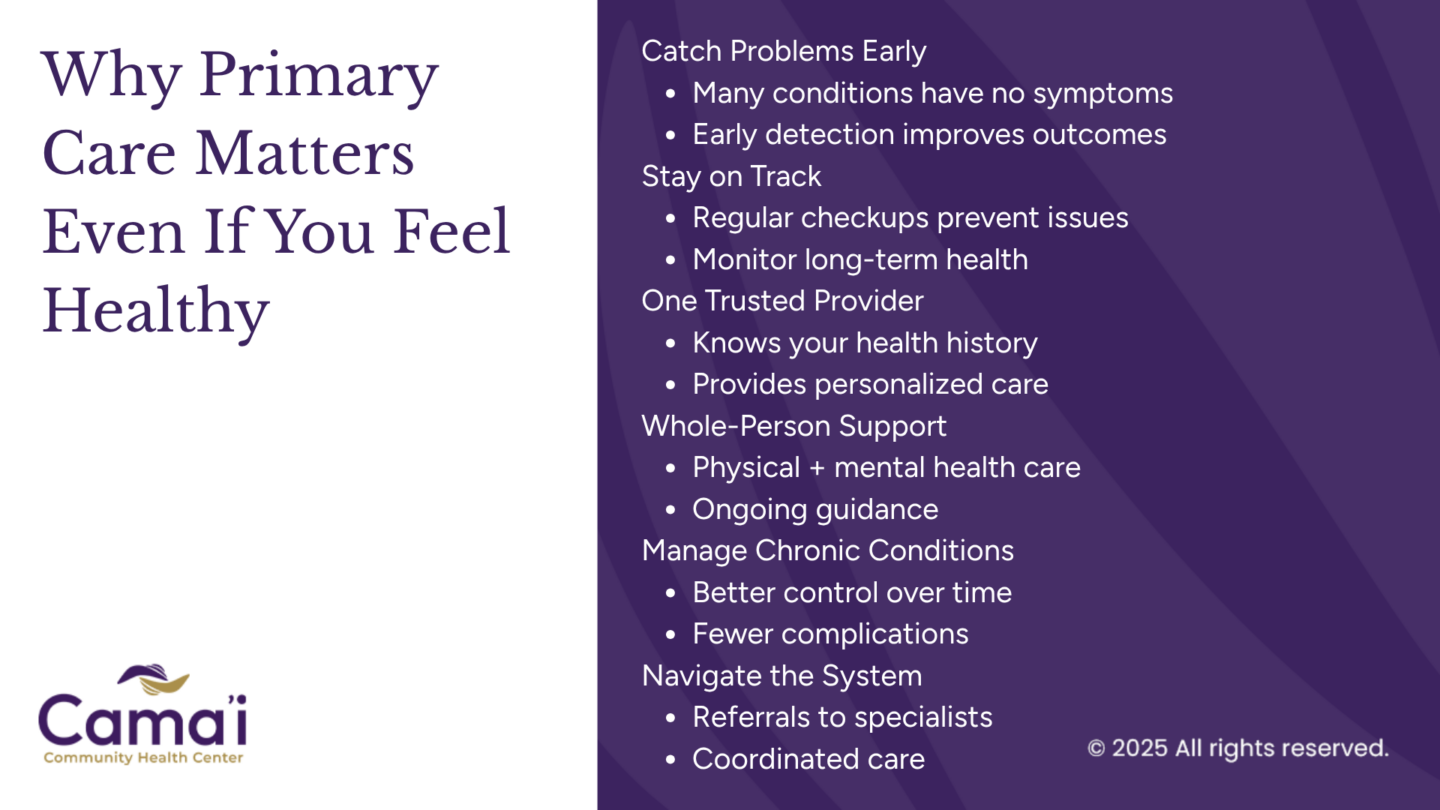 At Cama’i Community Health Center, we see primary health care as the foundation of long-term wellness. It’s not just where you go when something is wrong—it’s how you stay ahead of problems before they begin.