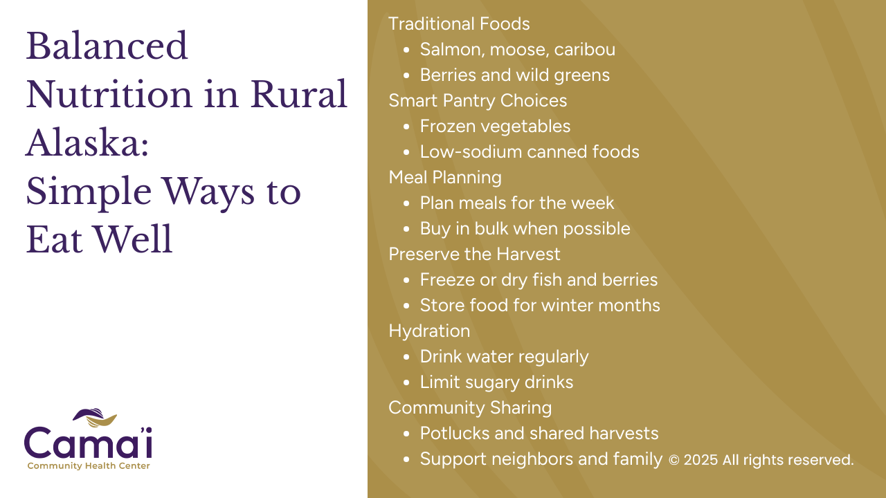 At Cama’i Community Health Center, we believe the path forward is not abandoning tradition — it’s strengthening it. By blending subsistence foods with thoughtful meal planning, smart preservation, and practical grocery strategies, families can build a diet that supports long-term health without sacrificing culture or flavor.