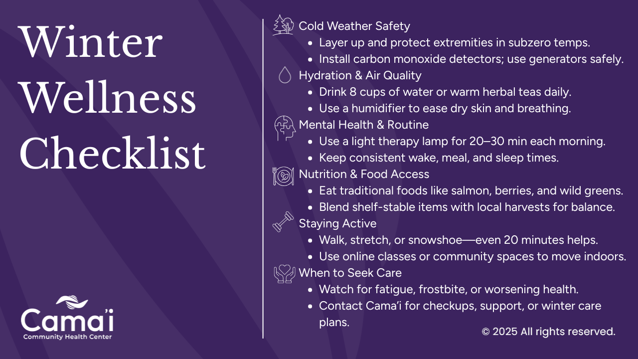 At Cama’i Community Health Center, we understand the unique conditions our communities face. Whether you’re a subsistence hunter, a busy parent, or an elder navigating chronic conditions, this guide is here to help you protect your health, energy, and well-being throughout the winter months.
